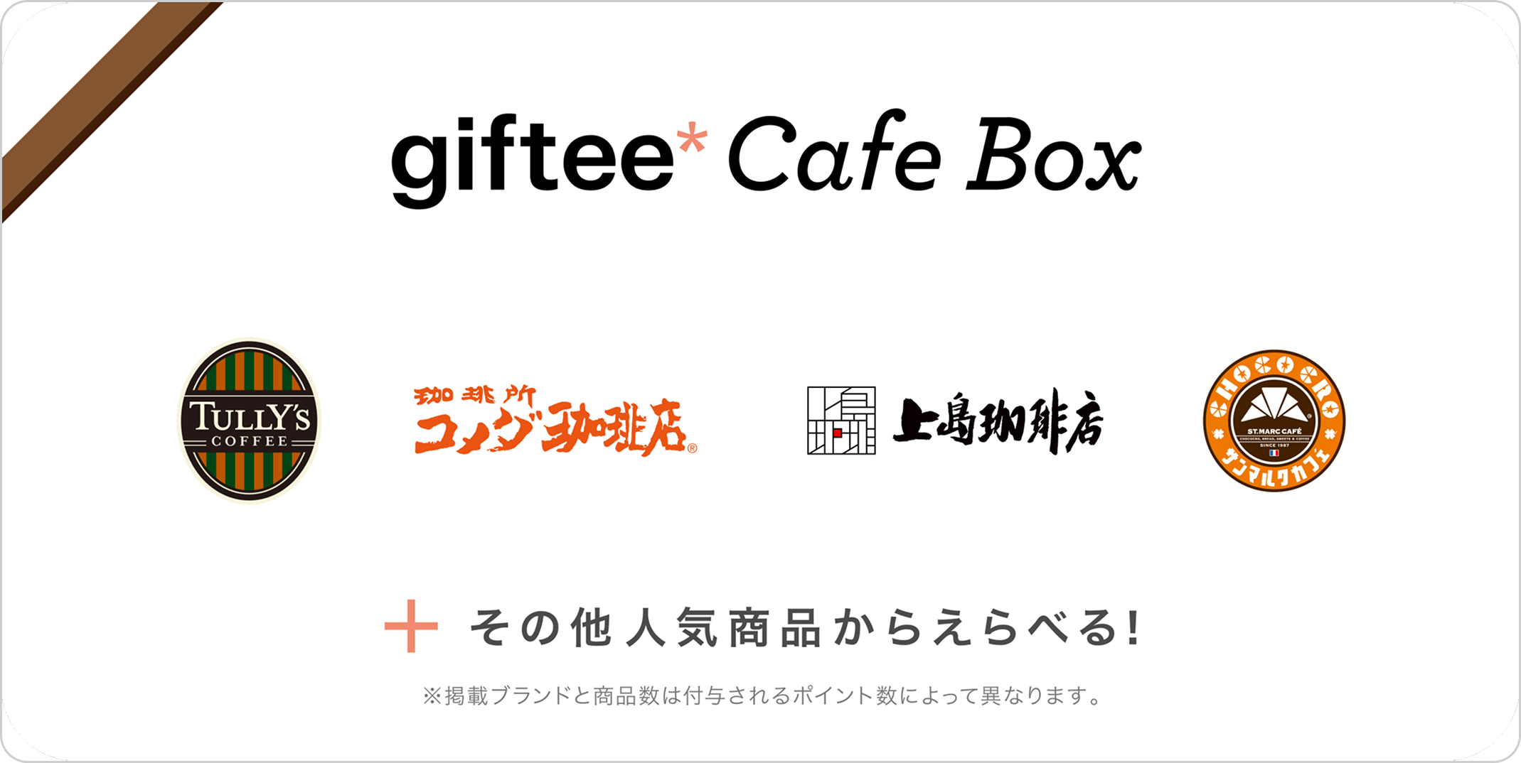 ラインナップおよび交換に必要なポイントは付与されたgiftee Cafe Boxにより異なり、変更になる場合がございます。またgiftee Cafe Box内のポイント交換レートは商品により異なります。記載された必要ポイント数をよくご確認の上、商品と交換してください。