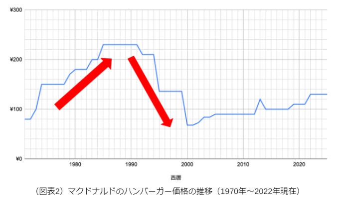 図表2はマクドナルドのハンバーガーの価格推移です。1970年代から1980年代は上昇局面、1990年代から2000年代は下降局面となっています。