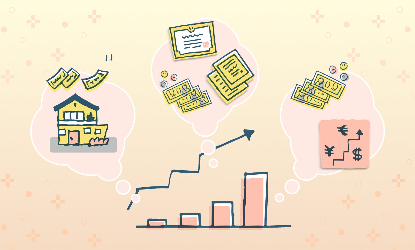 一方、長期的にインフレが続く場合には金銭の価値が徐々に低下するので、現金資産を現物資産や不動産資産などに分散させていくことを検討します。