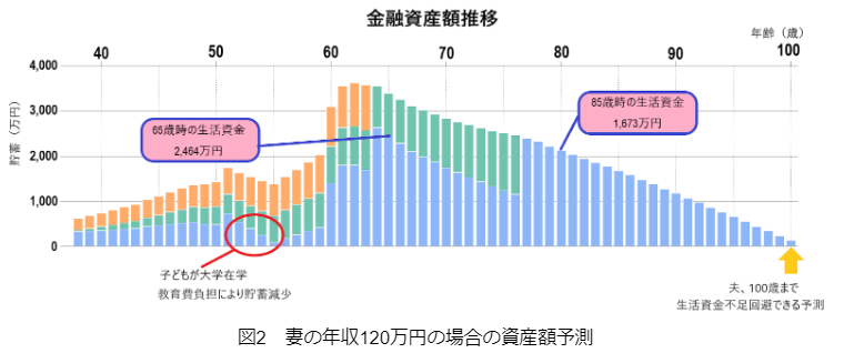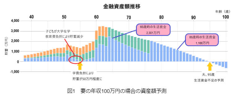 今のままで100歳まで生きたら、生活用の資金が足りなくなりそうっていう予測だよ。