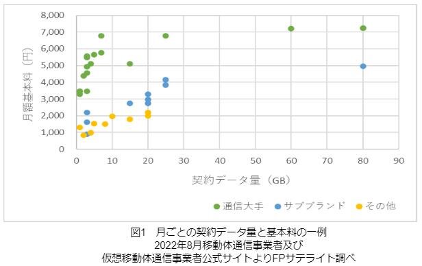 グラフの緑の点が大手、青がサブブランド、オレンジがその他の会社の基本料ね。