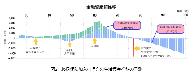 参考に、2,600万円の定期保険と400万円の終身保険を組み合わせたら毎月の保険料は9,000円くらいで、2人とも元気なシミュレーションはこうなったよ。