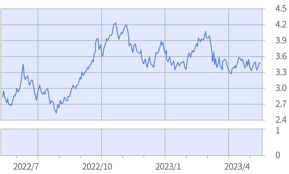 以下の、「米ドル/円 為替レート(図1)」と「米国長期金利(図2)」のグラフです。比較的連動していることがわかると思います。