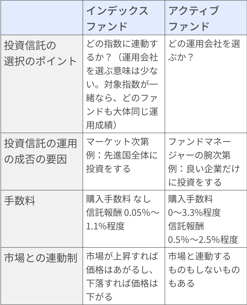 今回は、投資信託の選択の際に必ず疑問となる、「インデックスファンドとアクティブファンドの違い」についてまとめました。是非最後まで読んでみてください。