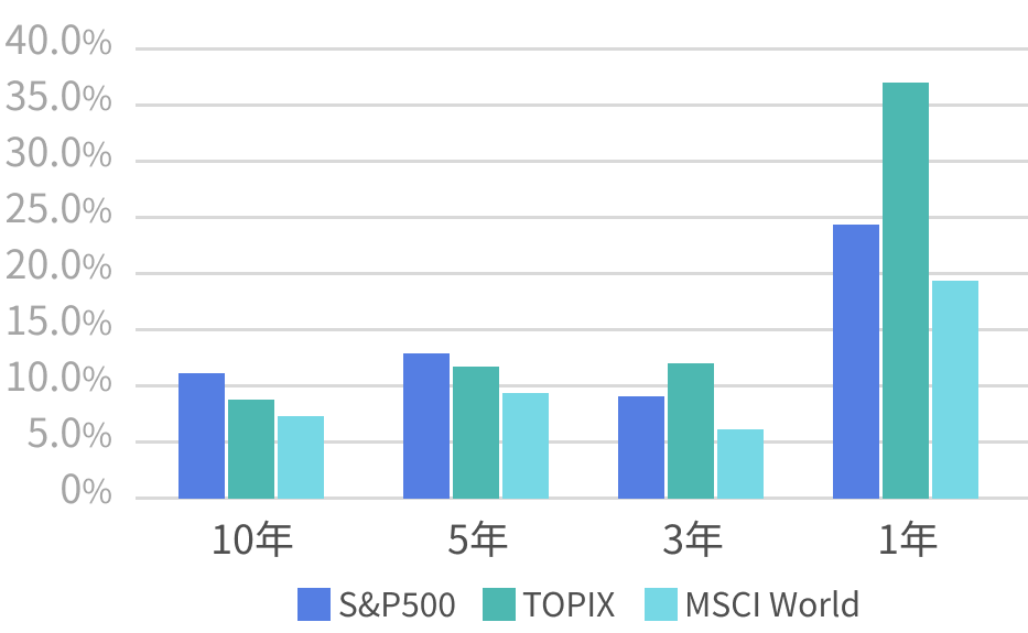 S&P500指数は、直近10年、5年と中長期的には他の指数を上回る運用成績を残しています。