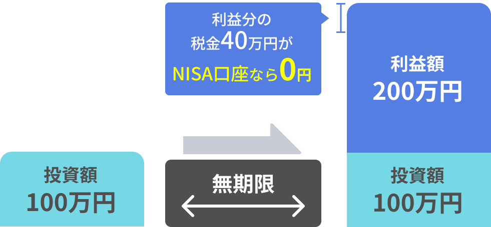 具体的には、100万円投資しして、300万円になった場合は通常は利益200万円に対して約40万円の税金がかかることとなりますがゼロとなります。
